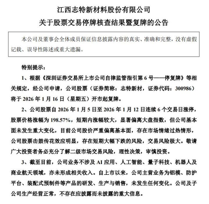 志特新材(300986.SZ)公告称,公司股票自2026年1月5日至12日连续6个交易日涨停,涨幅达198.57%,为维护投资者利益,公司就股票交易波动情况进行核查。经公司申请,公司股票自2026年1月13日开市起停牌,停牌期间,公司就股价波动的相关事项进行了核查。鉴于相关自查工作已完成,公司股票将于2026年1月16日(星期五)开市起复牌。公司业务不涉及AI应用、人工智能、量子科技、机器人及商业航天领域,主营业务为铝模、防护平台、装配式预制件等产品的研发、生产与销售。公司生产经营正常,不存在应披露而未披露的重大信息。